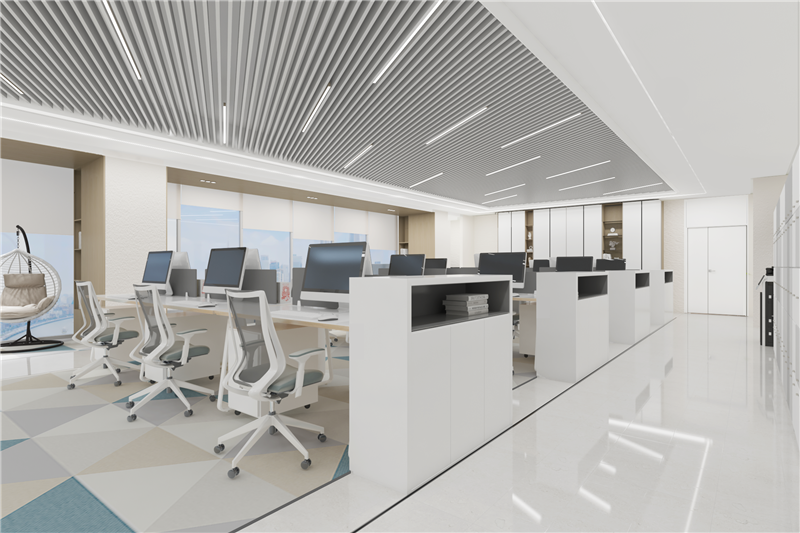 公共辦公室是公司較大的集體辦公區(qū)域,通常選擇統(tǒng)一間距的布燈方法,滿足大空間的光照均勻和舒適性。在選燈方面,建議采用“LED筒燈+燈盤(pán)”組合。