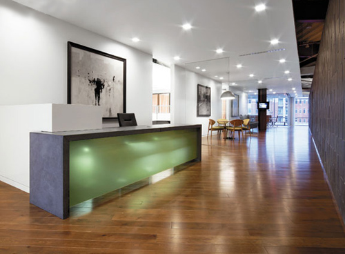 接待區(qū)地面滿鋪染色榆木地板。前臺由皂石與樹脂制作。接待區(qū)60英尺長的背景墻滿鋪板巖。