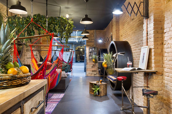多彩的吊床由植物染色纖維制成、如皇冠一般組合懸掛的綠植;未經(jīng)修飾的粗糙磚墻與光滑的防銹鐵件形成材質(zhì)上的對(duì)比;拋光混凝土地面映襯著鮮綠與溫暖的質(zhì)感。