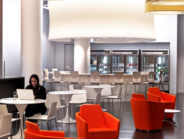 開放性的辦公區(qū),設(shè)計(jì)師使用餐廳質(zhì)感的訂制家具,取代以往的OA辦公家具,讓員工作業(yè)可以更加舒適愜意。設(shè)計(jì)師特別為業(yè)主規(guī)劃斜角天花及專業(yè)隔音系統(tǒng),讓每次聆聽音樂都是一場享受。