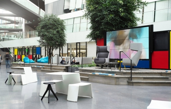 位于一樓的中庭主要是團(tuán)隊(duì)協(xié)作共創(chuàng)區(qū)、休閑區(qū)和大型吧臺(tái)服務(wù)區(qū)三大功能區(qū)塊,結(jié)合生機(jī)盎然的綠化共同交織而成一個(gè)開放、活力、精彩紛呈的時(shí)尚辦公空間。