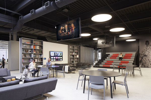 當然作為創(chuàng)意公司,這里還規(guī)劃了一處大型集會空間,用以全體員工的聚會等活動。各類創(chuàng)新座位區(qū),比如在大型集會區(qū)用作空間分隔的階梯看臺座椅等。室內(nèi)的裝飾表面也具有多功能性,比如墻體和結(jié)構(gòu)柱大量運用磁性玻璃、烤漆玻璃以及可黏貼或釘圖釘?shù)牟馁|(zhì),這樣可以隨時記錄創(chuàng)意構(gòu)想。