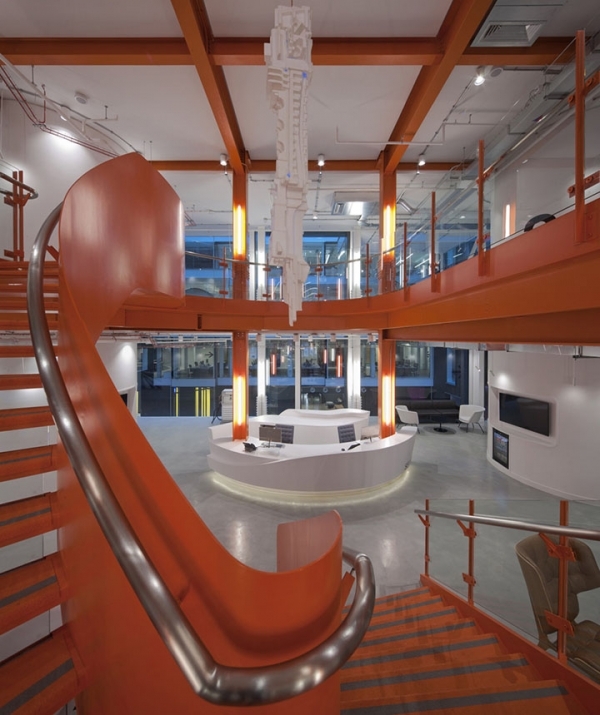 SEI總部辦公室裝修設(shè)計給人們帶來獨特的空間體驗,接待大廳一座定制的螺旋鋼樓梯和雕塑般的接待前臺。樓梯中間猶如宇宙飛船般的雕塑,是設(shè)計師嘗試用聚苯乙烯這種輕質(zhì)材料打造具有未來感的發(fā)光電塔.