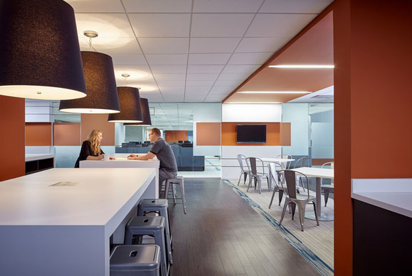 辦公室裝修設(shè)計(jì)以藍(lán)色來映襯橙色(公司標(biāo)識色),簡約而醒目的色塊組合營造出青春活力氛圍。整體色調(diào)與其企業(yè)風(fēng)格相呼應(yīng),形成統(tǒng)一的視覺體系。