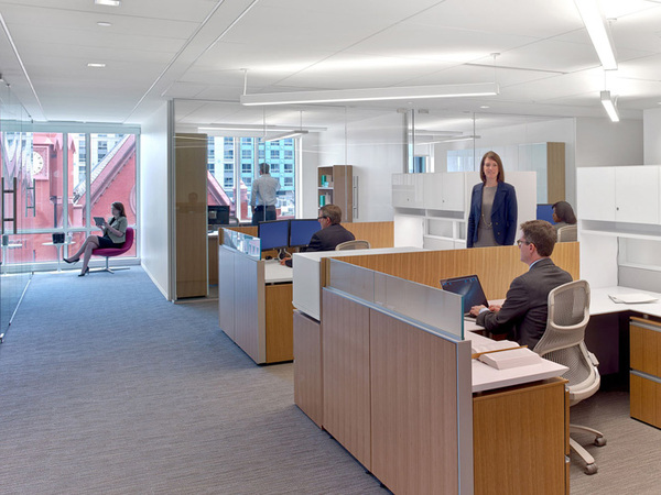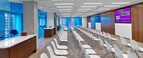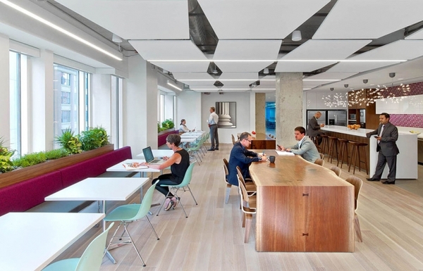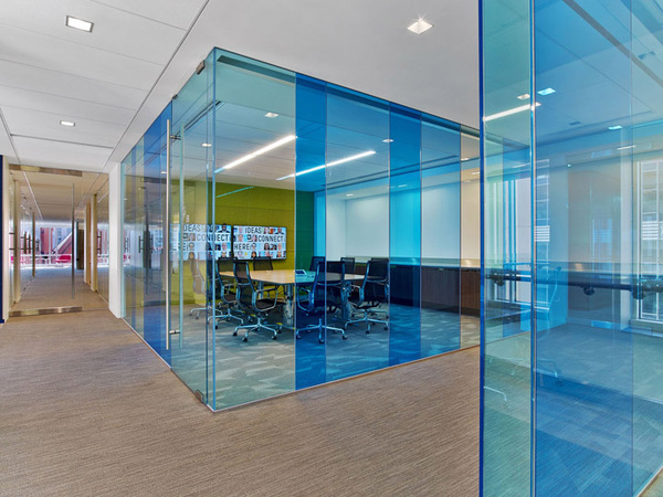 前臺(tái)右側(cè)的超大會(huì)議室被充滿通透感的半透明藍(lán)色玻璃板所環(huán)繞,打造出一片靈動(dòng)的空間。傳統(tǒng)的大角落辦公室也被開放式合作區(qū)域所取代。辦公室裝修設(shè)計(jì)保證了室內(nèi)采光充足且視野良好,保證90%以上的員工可以欣賞到室外風(fēng)景。
