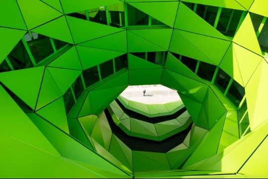 近來(lái),法國(guó)里昂海港區(qū)出現(xiàn)了一幢披著綠色外衣的大廈,它就是歐洲主流媒體之一的EuroNews新總部大樓。輕型的釉質(zhì)幕墻,覆有不規(guī)則的多孔鋁制包層。來(lái)源于河水顏色的靈感,讓綠色滲透到了辦公室的“骨血”中。