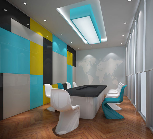 會議室的設計,設計師在設計的時候,以色彩鋪墊整個空間,以地圖對空間進行點綴,一則創(chuàng)意無限,二則說明思維的重要性。