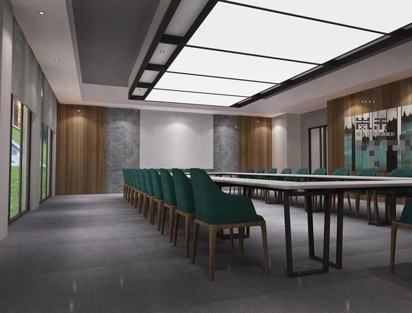 此處會議室設(shè)計(jì)有所不同,因?yàn)槠涞刂吩谪?fù)一層,設(shè)計(jì)師除了要保證本身的功能與格局外,還需要特別注意燈光的布置,設(shè)計(jì)師的目標(biāo)就是布置的簡單大氣且?guī)в猩虡I(yè)氣息。