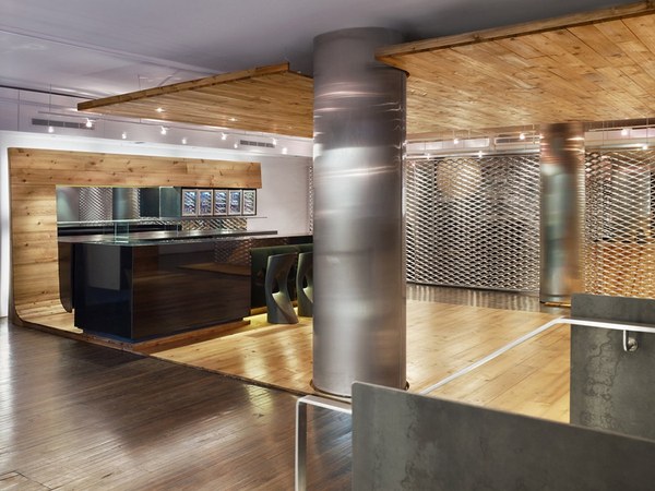 不同于其他各種材質(zhì)、各種類型的屏風和隔斷,設計師選用鋁網(wǎng)篩孔這一特殊的建筑材料將吧臺與開放式工作區(qū)巧妙分隔。