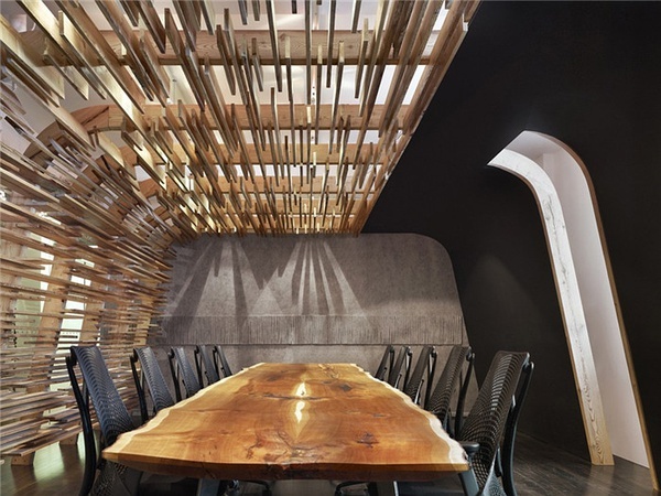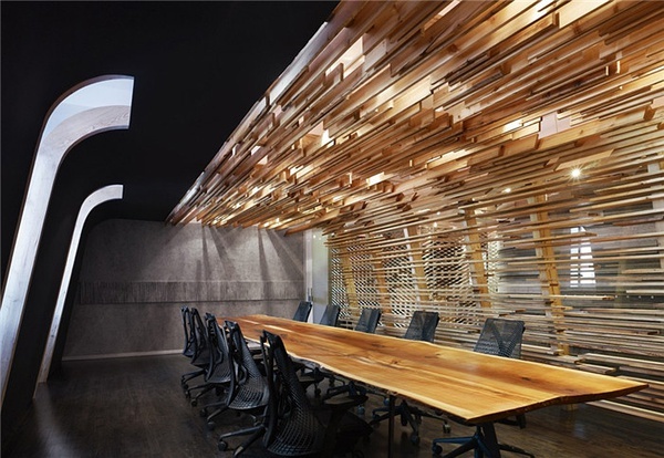 會議室的墻面由毛氈與黑板以及落葉松木條板組成,無序的條板構造像是牛身體內(nèi)的經(jīng)脈??臻g結構如同一艘小船或原始人居住的棚屋。