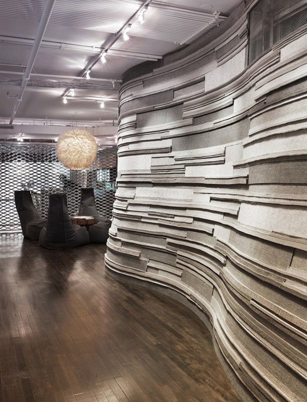 設計圍繞四個空間主題:休閑吧、線形開放式辦公位、羊毛氈飾面的空間結構體、以及大會議室。場所不僅適用于辦公需求,還兼有多重功能,如舉辦各種派對、發(fā)布會、開幕式、以及招待會等,因此休閑吧成為空間的重中之重。