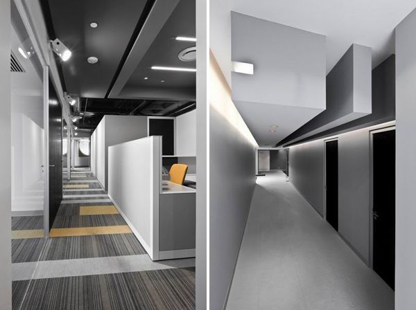 辦公室設(shè)計的辦公區(qū)域和走廊,灰色也不會顯得單調(diào)。灰色可以是地板,作為整個空間的輔助;也可以是主體,就像兩側(cè)墻壁上明暗不同的灰色組成的圖畫,吸引眼球。