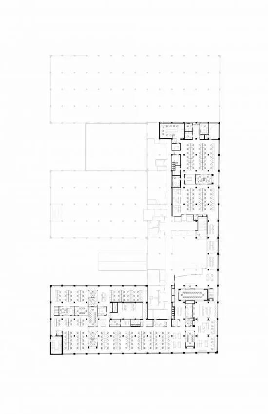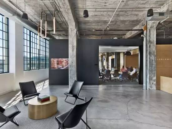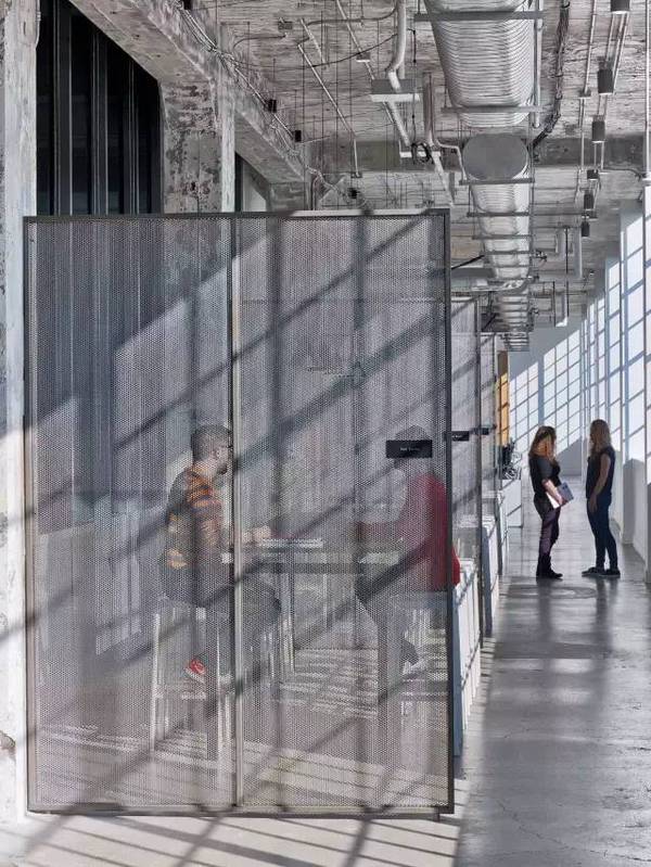 結(jié)構(gòu)柱和梁暴露在外,依然覆蓋著近乎一個(gè)世紀(jì)的涂料,*小程度的噴砂以防止剝落。表面和家具的靈感來自原始空間;自由形式盒子被包裹在膠合板和深灰色的板巖,椅子顏色從混凝土墻上采樣。設(shè)計(jì)師設(shè)計(jì)了一個(gè)穿孔金屬網(wǎng)系統(tǒng),以允許整個(gè)辦公室的開放性和流動(dòng)性。