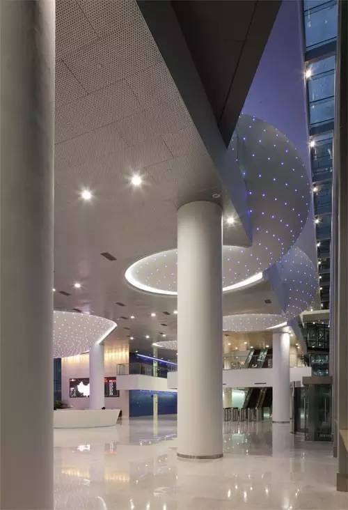 運(yùn)用現(xiàn)代簡(jiǎn)潔的設(shè)計(jì)手法,高雅明快的色調(diào),精致和諧的材料,設(shè)計(jì)師成功營(yíng)造出一個(gè)純粹干凈的國(guó)際化企業(yè)空間氛圍。中性高雅的色調(diào)成為空間的背景,而一些高科技的設(shè)備及材料:比如激光投射燈、穿孔金屬板的運(yùn)用,則表現(xiàn)出信息時(shí)代敏銳、高速的特色。通過(guò)合理組織參觀流線,有效串聯(lián)功能空間,設(shè)計(jì)強(qiáng)化了室內(nèi)環(huán)境與內(nèi)院環(huán)境、室外環(huán)境的聯(lián)系與互動(dòng),做到空間次序明確同時(shí)各部門(mén)又各具特色。建筑良好的視線及引入建筑的陽(yáng)光、綠化,則充分與小型討論區(qū)、會(huì)議單元、咖啡區(qū)休息區(qū)結(jié)合起來(lái),使辦公環(huán)境輕松化、特色化、人性化。
