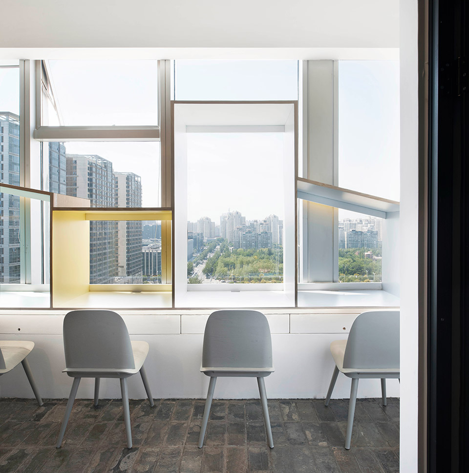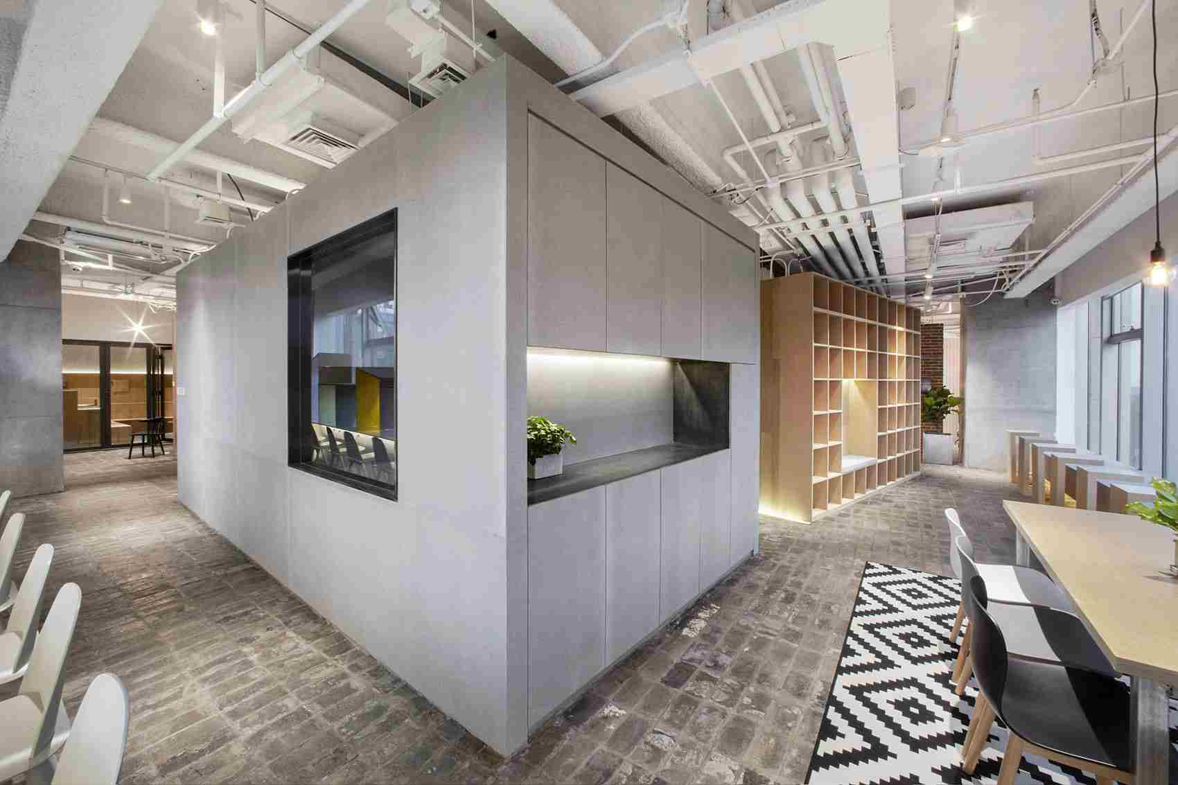本案的空間的設(shè)計(jì),與傳統(tǒng)的教室的設(shè)計(jì)有所不同。設(shè)計(jì)的核心概念為社區(qū),它由五個(gè)不同材質(zhì)的盒子,圍合出功能不同的區(qū)域空間,比如,書房,廚房,辦公交流等公共區(qū)域。房間內(nèi)則是教室,每個(gè)房間都擁有良好的視野和光線。