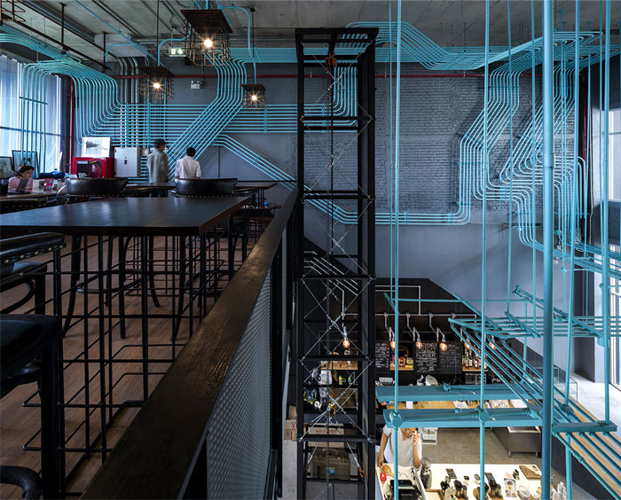 整個(gè) Co-Working Space 面積寬敞,以工業(yè)廠房的形式接待著來(lái)訪的客人,稍經(jīng)修飾的地面與裸露的混凝土立柱,帶來(lái)*為原始、粗獷的空間魅力,一層為咖啡廳,從售賣各種食品的吧臺(tái)到充滿工業(yè)感的桌椅,很難將它與工作空間聯(lián)想到一塊。