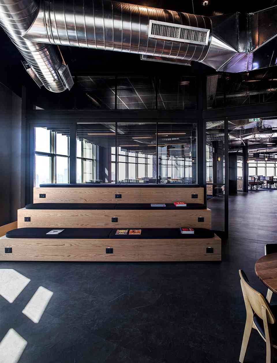 粗糙的原木、不加修飾的混凝土核心筒墻體以及銹色的金屬結(jié)構(gòu)凸顯了這個(gè)辦公空間的工業(yè)氣息?!扒擅畹卦O(shè)計(jì)讓位于城市中心的辦公空間能夠與公司所有數(shù)據(jù)的來源 – 船只發(fā)生了聯(lián)系。我們有意避免了讓人能夠聯(lián)想起豪華游艇的任何元素,而是渲染出一種如同工業(yè)港口般的粗糙氛圍?!笔聞?wù)所創(chuàng)始人Roy David解釋道。