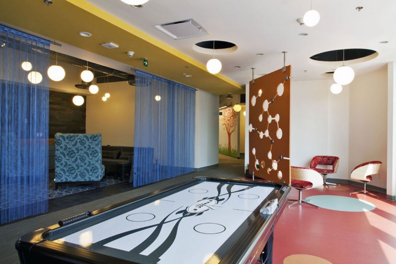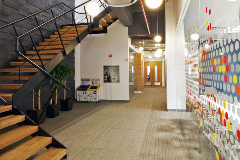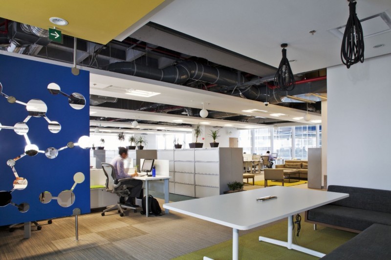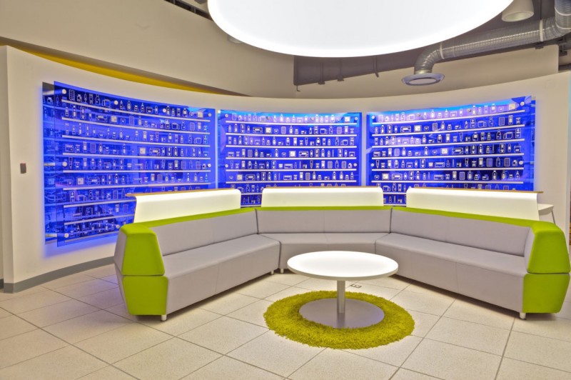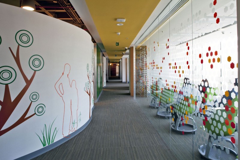 辦公空間的設(shè)計簡約時尚而充滿童趣,走出電梯間便是一個圓形的開敞式接待區(qū),接待區(qū)兩側(cè)是由兩個藍(lán)色玻璃組成的展示墻,玻璃上繪有興康藥品產(chǎn)品外形樣式,接待區(qū)的中間區(qū)域是以綠色植物為背景的接待臺。走廊兩側(cè)的墻壁上繪畫著抽象的圖案,圖像有著積極向上和強勁生命力的寓意,符合興康的企業(yè)文化。在工作區(qū)設(shè)計師打破了千篇一律的工作形式,營造了一個輕松,寬敞,開放,點綴著休閑元素的辦公環(huán)境,家具的高度被刻意的降低,目的是為了讓所有的工作人員都能享受自然光和戶外迷人的景色。